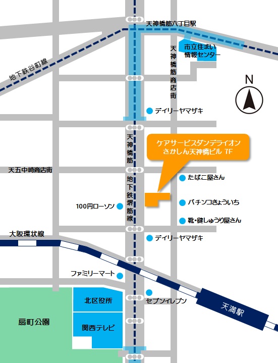 - ※大阪環状線でお越しになる場合は『天満駅』がバリアフリーに対応していますので、天神橋筋商店街もしくは