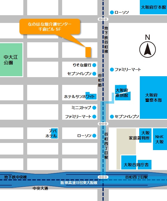 - 地下鉄谷町線・中央線『谷町四丁目駅』の4番出口を出て右に曲がり、北に向かって徒歩5分。
